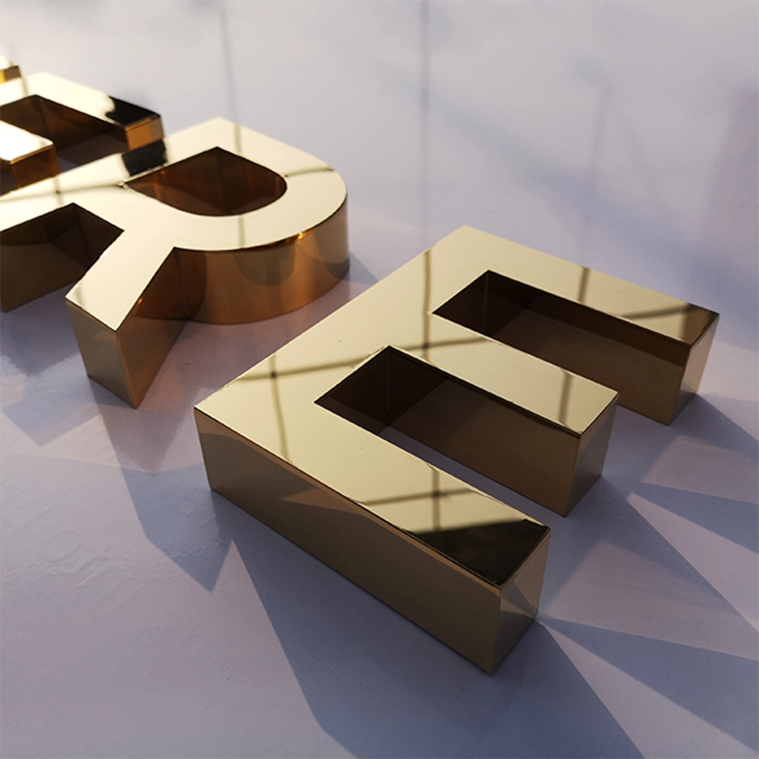 - These signs add a touch of luxury with a golden mirror finish. They are popular among beauty businesses and retail in malls, providing a high-end appearance. They are less common in the Canadian signage industry, which makes them a unique choice for brands seeking exclusivity.
